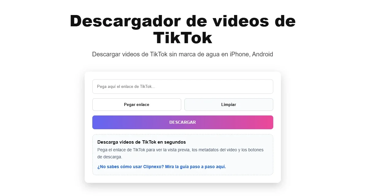 EN UNA FRASE: Clipnexo es una plataforma de descarga gratuita que permite a creadores, marketers y usuarios casuales descargar videos y audio de TikTok en segundos, sin registrarse ni instalar nada.